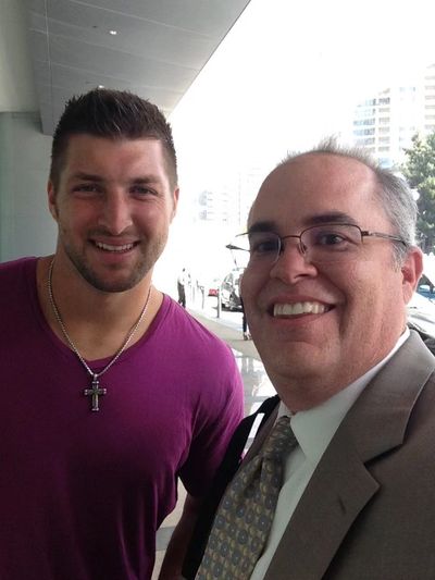 Geoff Maleman, past president of the Rotary Club of Westchester, catches up with former NFL quarterback Tim Tebow in Century City.